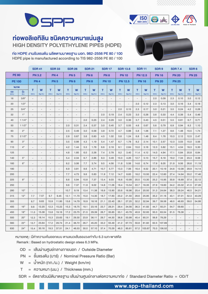 • ขนาดมิติท่อ HDPE PE80 เป็นไปตามมาตรฐาน มอก.982-2556 /TIS.982-2556